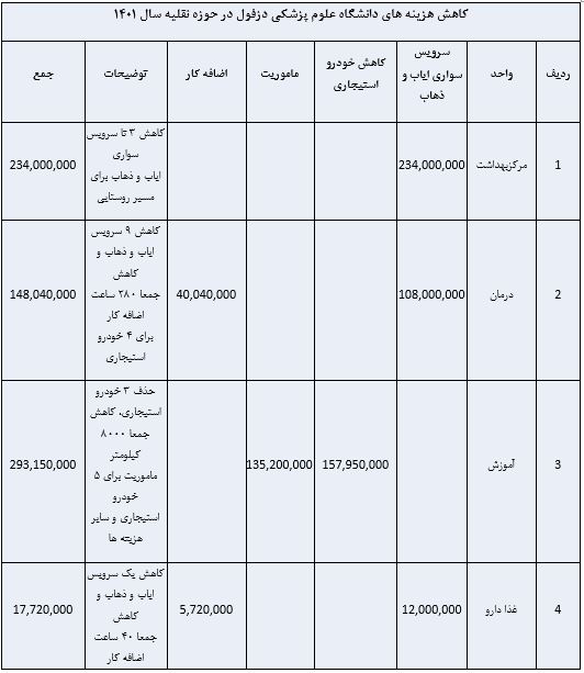 واحد حمل و نقل پس از دستور و مجوز از ریاست محترم دانشگاه در خصوص کم کردن تعداد خودروها توانست باعث کاهش هزینه های سازمان گردد که گزارشی از آن در جدول زیر آمده است.