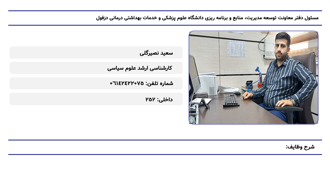 -انجام مکاتبات مربوط به دفتر معاونت -برقراری تماسهای خواسته شده از سوی معاونت توسعه - اقدام نامه های ارجاع شده از سوی معاون توسعه -انجام سایر امور محوله طبق دستور مقام مافوق -تنظیم لیست متقاضیان ملاقات با معاون مربوطه -پاسخگوئی به تماس های تلفنی - ابلاغ دستورات صادره معاونت مربوطه به اشخاص و واحدهای تابعه برحسب خط مشی تعیین شده -راهنمایی متقاضیان و مراجعه کنندگان به دفتر معاونت |